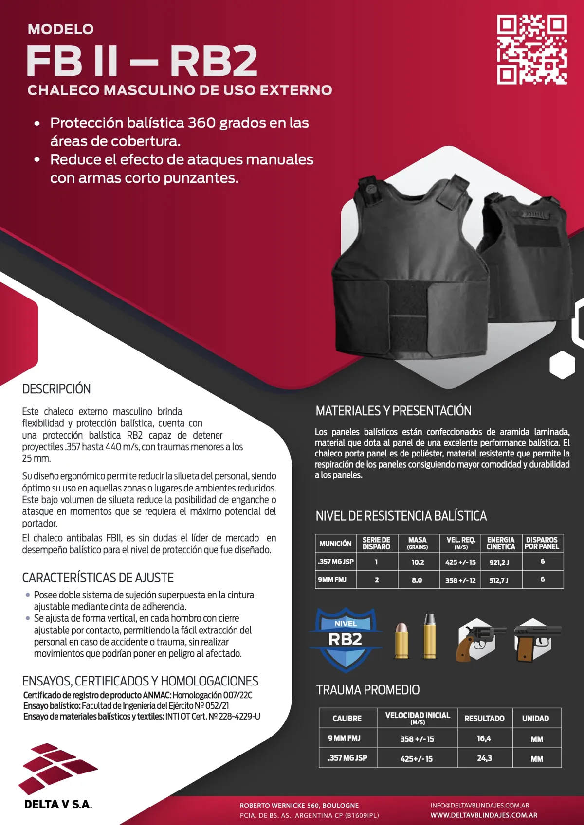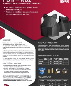Este chaleco externo masculino brinda flexibilidad y protección balística, cuenta con una protección balística RB2 capaz de detener proyectiles .357 hasta 440 m/s, con traumas menores a los 25 mm. Su diseño ergonómico permite reducir la silueta del personal, siendo óptimo su uso en aquellas zonas o lugares de ambientes reducidos. Este bajo volumen de silueta reduce la posibilidad de enganche o atasque en momentos que se requiera el máximo potencial del portador. El chaleco antibalas FBII, es sin dudas el líder de mercado en desempeño balístico para el nivel de protección que fue diseñado.