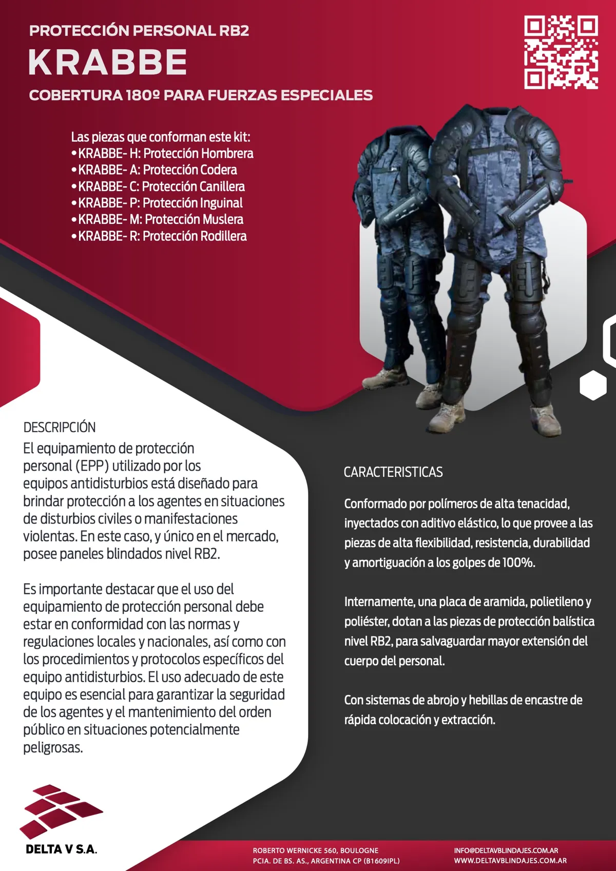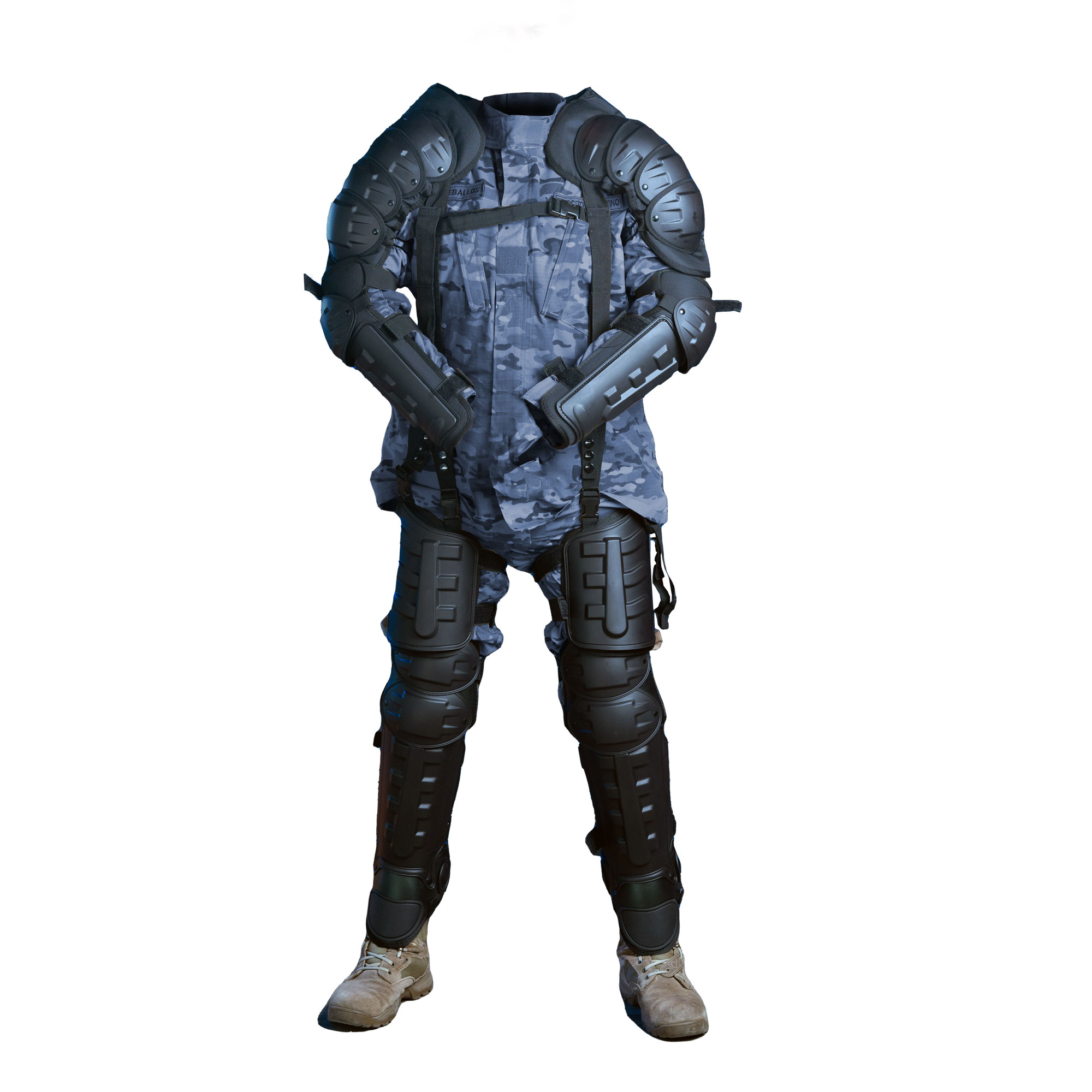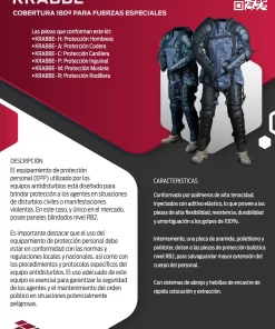 El equipamiento de protección personal (EPP) utilizado por los equipos antidisturbios está diseñado para brindar protección a los agentes en situaciones de disturbios civiles o manifestaciones violentas. En este caso, y único en el mercado, posee paneles blindados nivel RB2.
