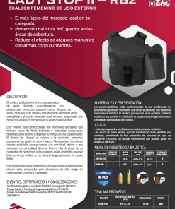 El chaleco antibalas femenino es una prenda de vestir diseñada específicamente para proporcionar protección personal contra disparos de armas de fuego. Este chaleco está diseñado pensando en la comodidad y el ajuste adecuado para mujeres, asegurando una protección eficaz sin comprometer el estilo o la movilidad. Este chaleco está confeccionado con materiales avanzados que incluyen capas de fibras balísticas y materiales compuestos, diseñados para detener y dispersar la energía de una bala entrante. El diseño del chaleco se adapta a la anatomía femenina, asegurando un ajuste cómodo y seguro. Tiene paneles frontales y tirantes ajustables para garantizar una movilidad óptima y una sensación de comodidad durante todo el día. A pesar de su capacidad de protección, estos chalecos están diseñados para ser livianos, lo que facilita su uso durante largos períodos sin causar fatiga. Este chaleco antibalas femenino es una pieza esencial para quienes desean estar preparadas para situaciones de alto riesgo sin comprometer su estilo o comodidad