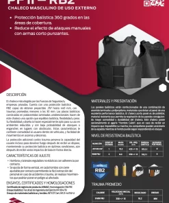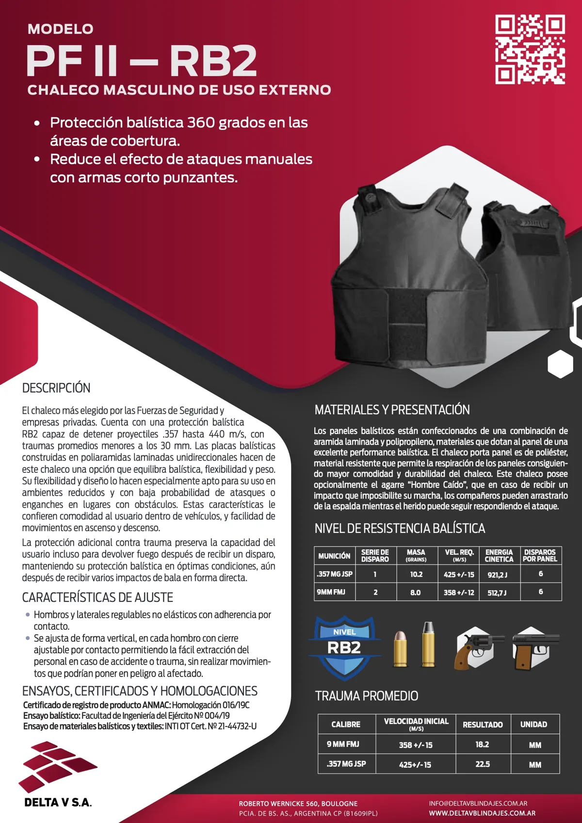 El chaleco más elegido por las Fuerzas de Seguridad y empresas privadas. Cuenta con una protección balística RB2 capaz de detener proyectiles .357 hasta 440 m/s, con traumas promedios menores a los 30 mm. Las placas balísticas construidas en poliaramidas laminadas unidireccionales hacen de este chaleco una opción que equilibra balística, flexibilidad y peso. Su flexibilidad y diseño lo hacen especialmente apto para su uso en ambientes reducidos y con baja probabilidad de atasques o enganches en lugares con obstáculos. Estas características le confieren comodidad al usuario dentro de vehículos, y facilidad de movimientos en ascenso y descenso.