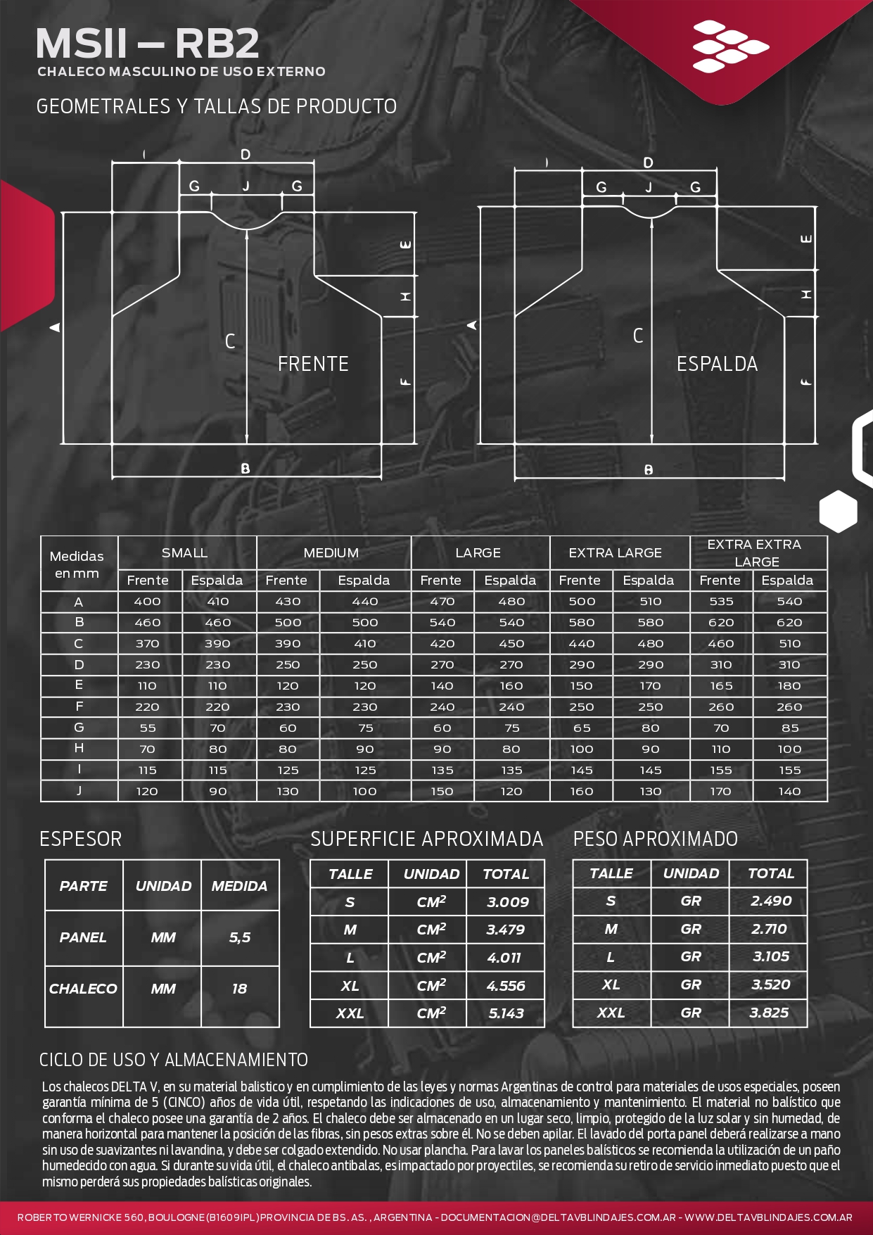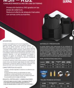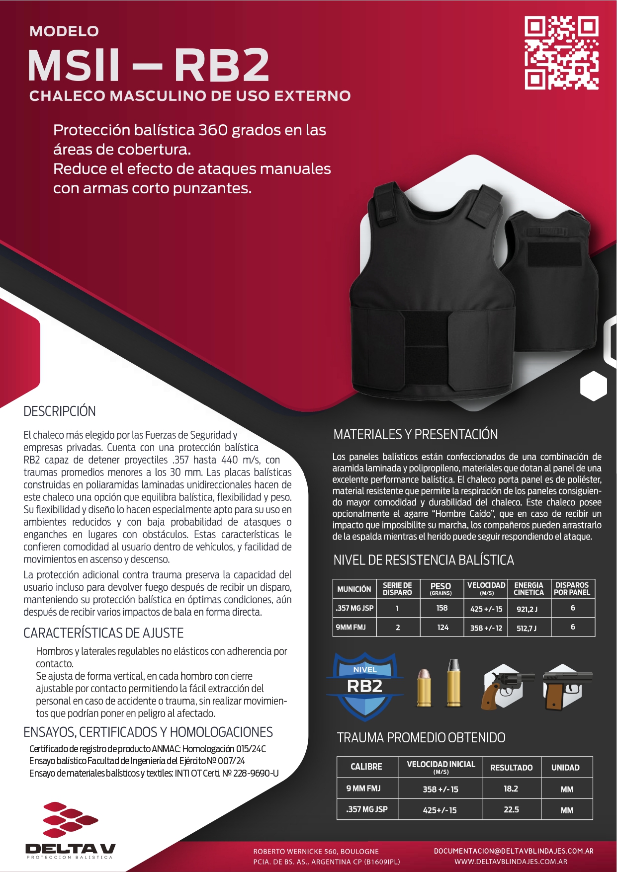 El chaleco más elegido por las Fuerzas de Seguridad y empresas privadas. Cuenta con una protección balística RB2 capaz de detener proyectiles .357 hasta 440 m/s, con traumas promedios menores a los 30 mm. Las placas balísticas construidas en poliaramidas laminadas unidireccionales hacen de este chaleco una opción que equilibra balística, flexibilidad y peso.