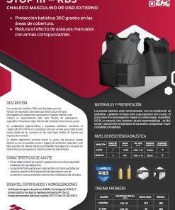 Los paneles balísticos están confeccionados con una combinación de polietileno y poliéster no tejido como capa expansiva anti trauma . El porta panel en su homologación original es confeccionado en poliéster 100%, un material ultra resistente de alta impermeabilidad, de fácil lavado y que permit e la respiración de los paneles consiguiendo mayor comodidad y durabilidad