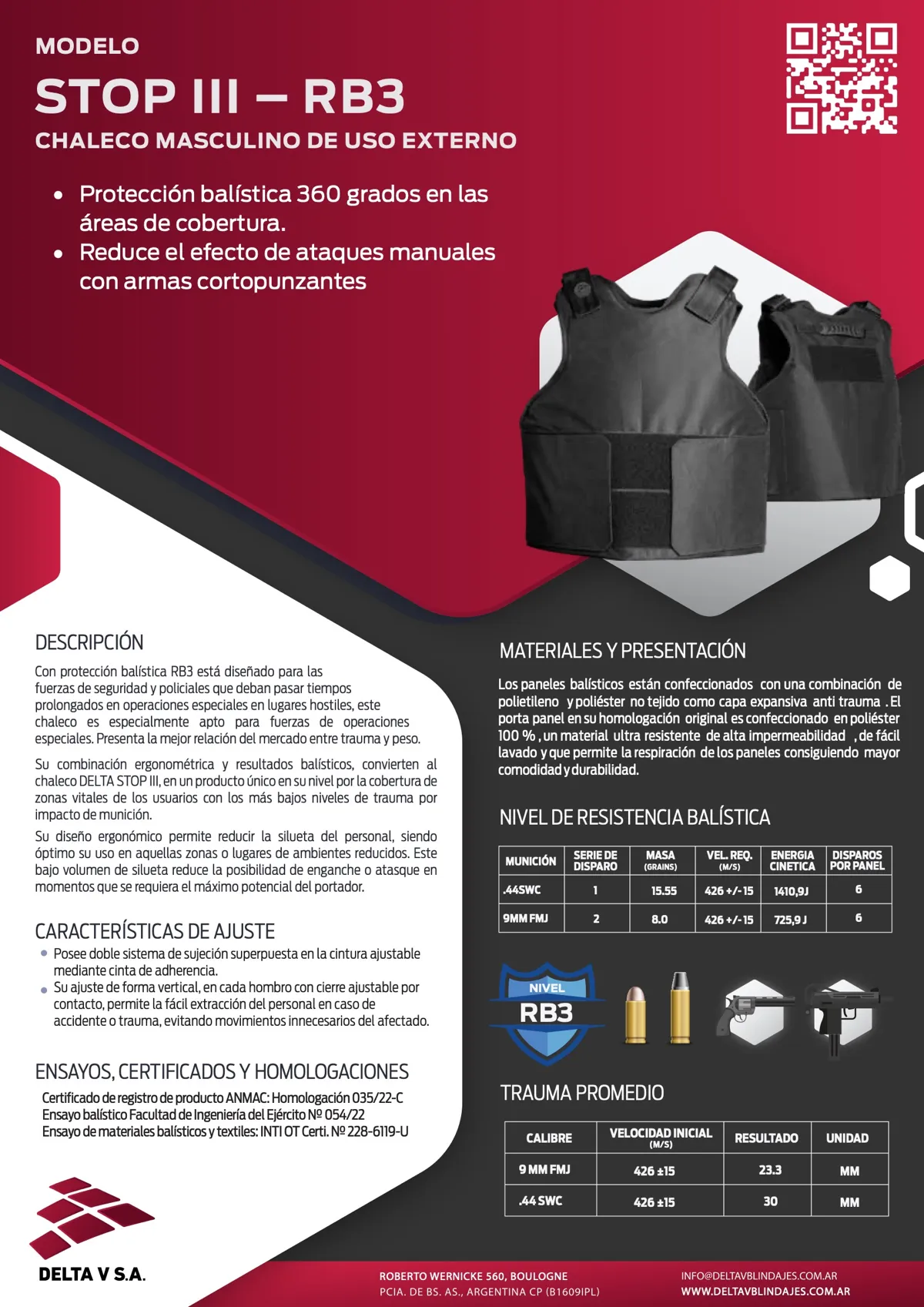 Con protección balística RB3 está diseñado para las fuerzas de seguridad y policiales que deban pasar tiempos prolongados en operaciones especiales en lugares hostiles, este chaleco es especialmente apto para fuerzas de operaciones especiales. Presenta la mejor relación del mercado entre trauma y peso. Su combinación ergonométrica y resultados balísticos, convierten al chaleco DELTA STOP III, en un producto único en su nivel por la cobertura de zonas vitales de los usuarios con los más bajos niveles de trauma por impacto de munición. Su diseño ergonómico permite reducir la silueta del personal, siendo óptimo su uso en aquellas zonas o lugares de ambientes reducidos. Este bajo volumen de silueta reduce la posibilidad de enganche o atasque en momentos que se requiera el máximo potencial del portador.