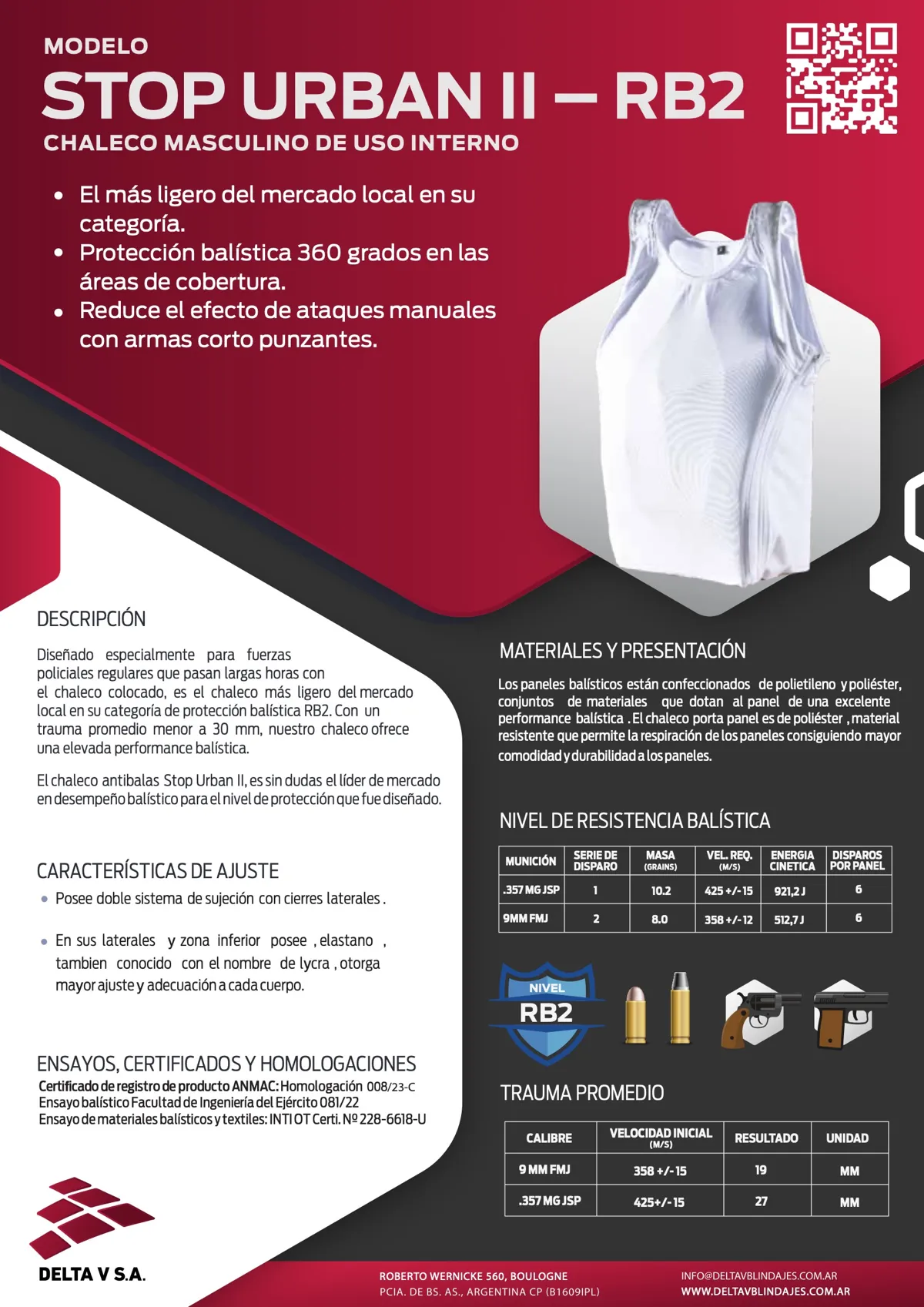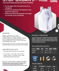 Diseñado especialmente para fuerzas policiales regulares que pasan largas horas con el chaleco colocado, es el chaleco más ligero del mercado local en su categoría de protección balística RB2.